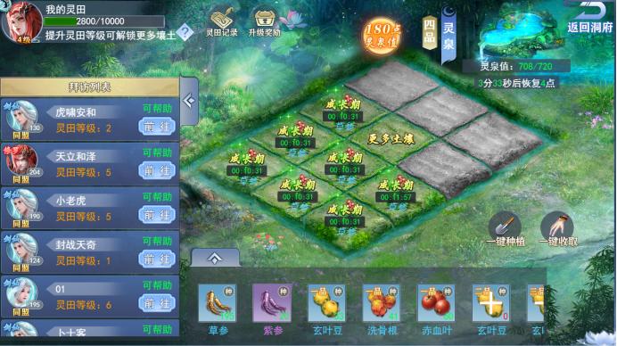 灵田等级越高种植的草药越多,草药在打BOSS中是会有些许掉落,玩家可以使用灵泉值来给种植的草药浇水,让它快速成长。