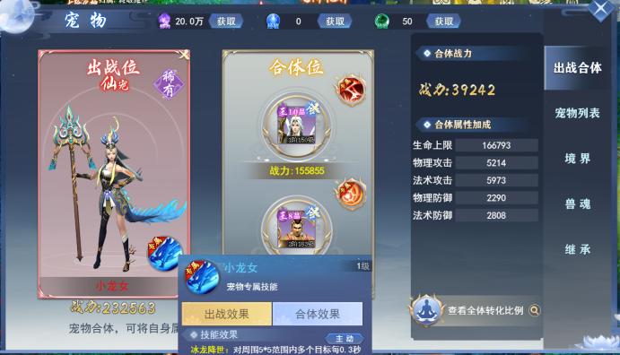 2.宠物是修仙之路必不可少的重要伙伴,宠物合体是可以增加自身的属性,出战每一个宠物都有一个特殊的技能,在战斗中可以发挥极致的效果哦~