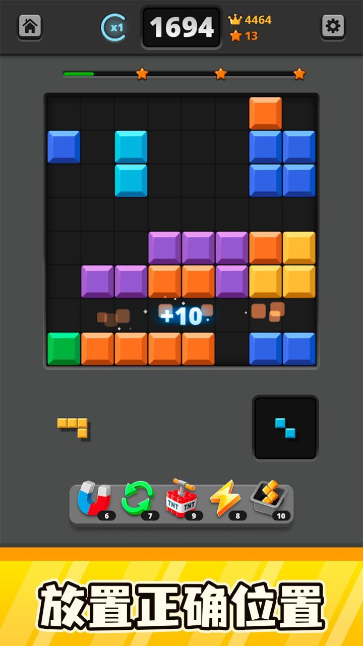 简单易上手: 游戏操作简单易上手,适合所有年龄段的玩家。只需使用简单的触控操作即可旋转、移动和放置方块,使游戏变得流畅而愉快。