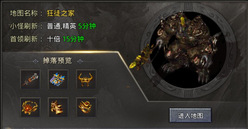 第五个是一转地图狂徒之家,从这个地图开始掉落的装备开始有转生要求,需要达到对应转生等级才可以穿戴,可掉落迷失系列装备