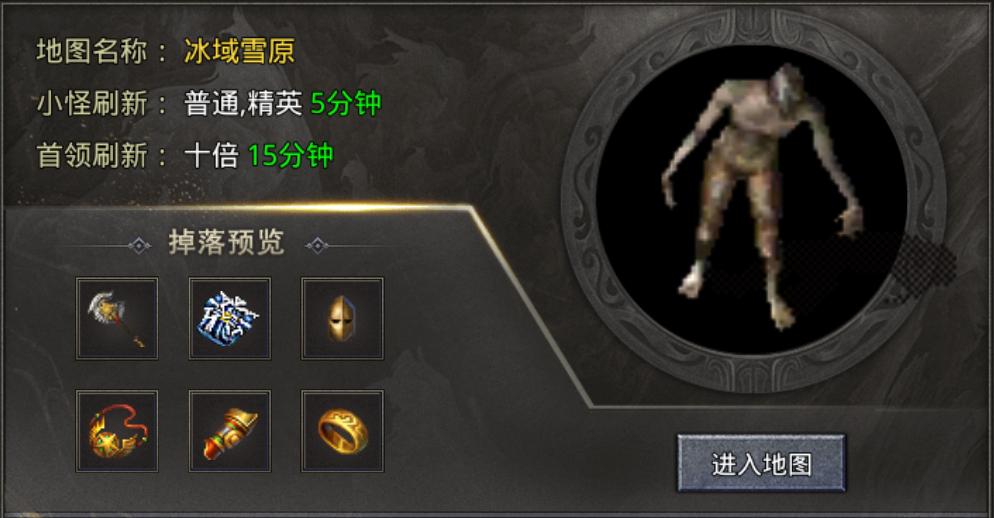 第二个是初级地图冰域雪原,是玛法大陆上古时期神魔大战分离出去的一块神秘土地,可掉落清风系列装备