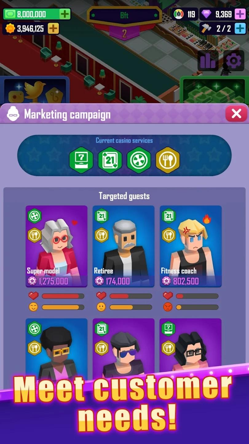 玩家需要管理自己的资源,例如金币和钻石等,以便购买设备和升级赌场。