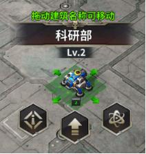 该区域是可以操作的基地建设区域,点选建筑即可选中并进行拉动、选择功能等操作,对各个建筑进行查看、部署、升级,及根据具体建筑的功能来采取相应的行动,如科研部的“研究”功能就在指挥官的实力提升方面有着举足轻重的地位。