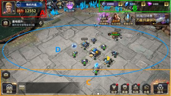 该区域主要集中了游戏的各种功能系统入口,包括战斗、仓库、英雄、科研、邮件、商店、聊天功能等,指挥官可以由此进入具体功能的操作页面,来管理、建设发展基地,提升自身实力。