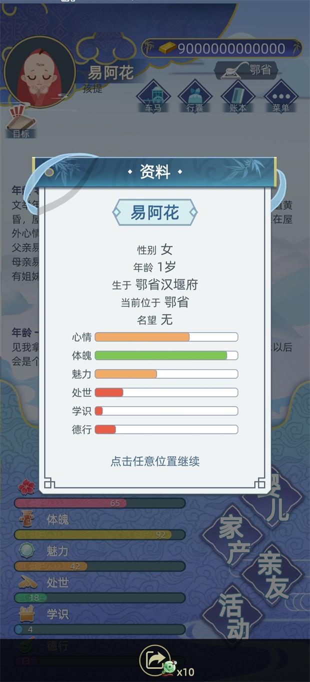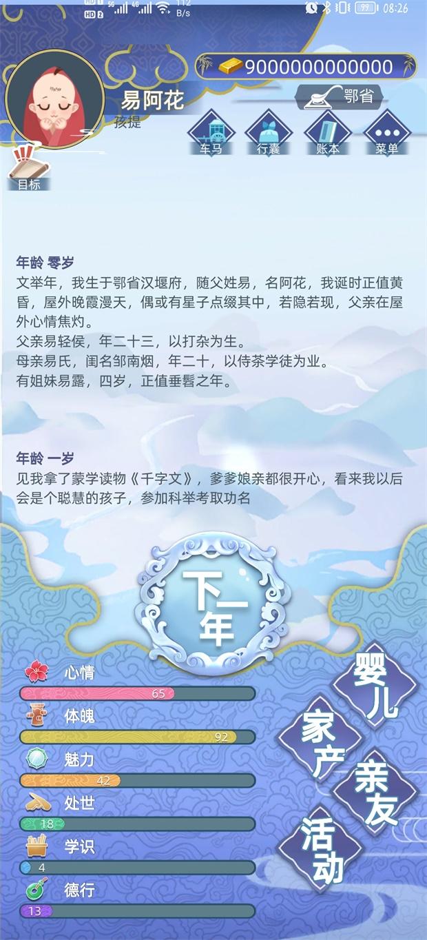 古代人生最新破解版给玩家修改成了银两变化锁定大量,天赋解锁和升级反加玉佩,这是一款非常真实好玩的古代人生模拟游戏,自由度非常的高,您将随机扮演古代一个人的一生,在您成长的过程中要做出许多的选择,然而您的出生也会影响着未来;