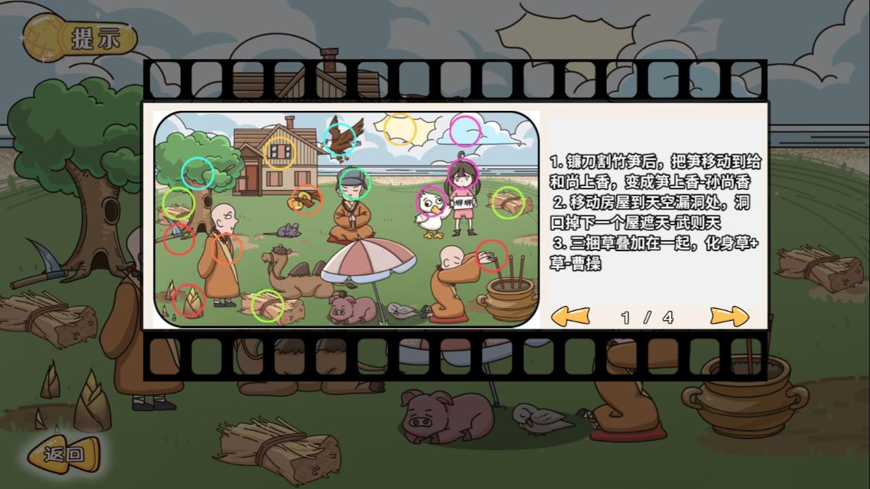 7.点击和尚两下帽子,让太阳光透过和尚的头折射到猪和鸽子身上,变成为诸葛亮