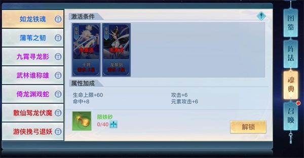 在图鉴界面中,玩家们能看到目前所收集的所有兵魂伙伴,点击卡片即可进入兵魂的养成界面,在这里可以消耗碎片对兵魂人物进行激活、升星,消耗陨铁砂可对兵魂伙伴进行升阶。