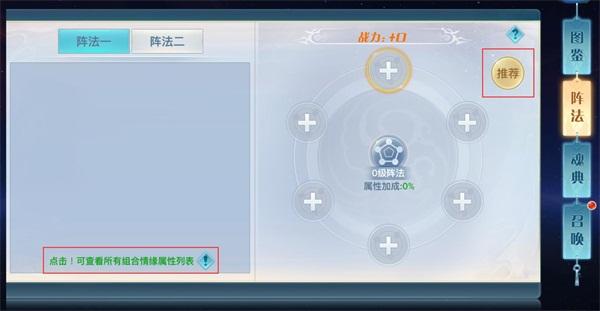 接下来就到了上阵界面~这里我们选择兵魂伙伴上阵出战,上阵伙伴可以提升主角战斗力。而左边那两个切换阵容开启后玩家就可以更快捷的切换出战阵容,打起架来方便的不要不要的。右边可以直接看到上阵兵魂伙伴后获得的属性和战力加成。对于萌新玩家,只要点击推荐按钮就可以看到适合你的阵容搭配哦。