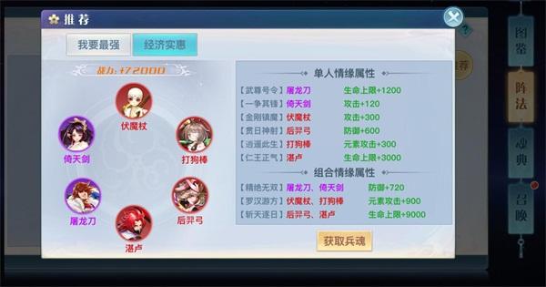 这里点进去就可以查看兵魂伙伴的羁绊和激活条件。拥有的兵魂人物与进阶等级全部满足缘分要求后缘分会被激活,激活缘分后人物角色就会获得相应的属性加成。