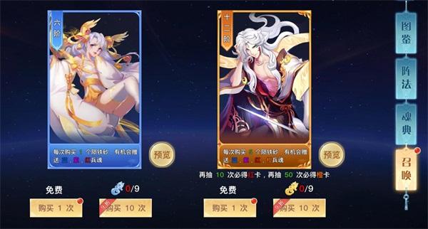 最后一个召唤界面就是获得兵魂伙伴的途径,分为每次购买1个陨铁砂(蓝、紫、红)和购买5个陨铁砂(蓝、紫、红、橙),十连抽会保底出红卡。阶级和品级越高的伙伴属性越好,能够转化给玩家的属性也越好哦。