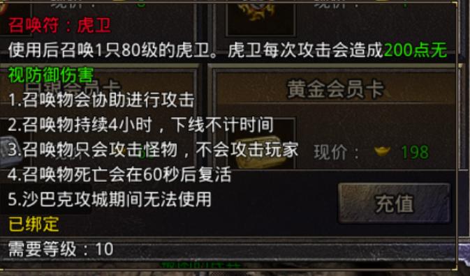 第二种,虎卫,需要等级10级才能召唤,固定伤害为200点,可用8元宝购买,白银会员每天可以通过领取工资的形式来获取一张虎卫召唤符,或者购买6元直购礼包获得。