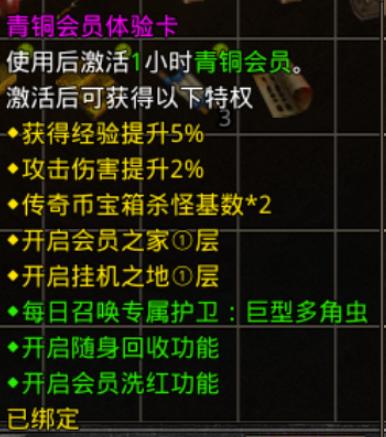 青铜会员:可以用18元宝通过商城购买,或者玩家直充30元时也可获得一张青铜会员卡,时长为1个月。