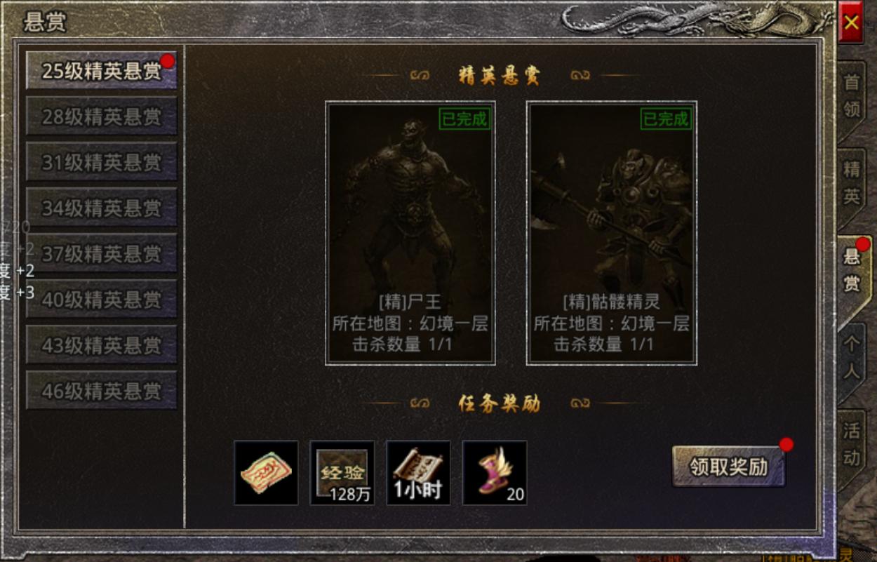 当玩家升到30级时,会开启精英悬赏任务,任务需要玩家击杀不同等级的精英怪才能完成任务,任务完成后可以获得大量经验和增加幻境的时间,需注意的是此任务不是每日任务,玩家只能完成一次。