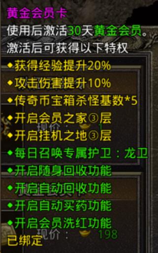 黄金会员:可以用198元宝通过商城购买,或者玩家直充500元时也可获得一张黄金会员卡,时长为1个月。