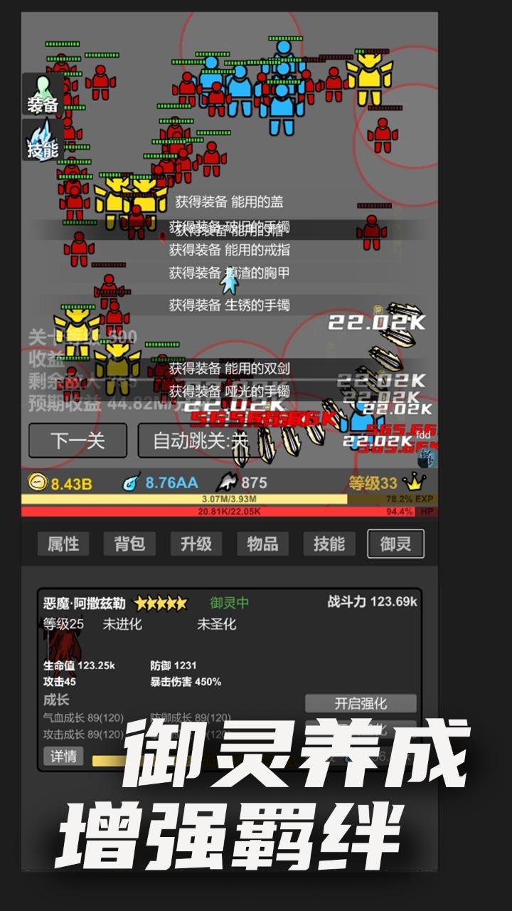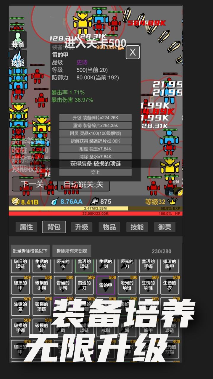 无限升级是一款挂机类型的rpg冒险游戏,游戏有着最为传统的玩法,通过挂机战斗就可以获得各种奖励,使用不同属性的道具与技能进行搭配,并进行升级,提高各方面的能力,不断的去杀怪获得各种成就。