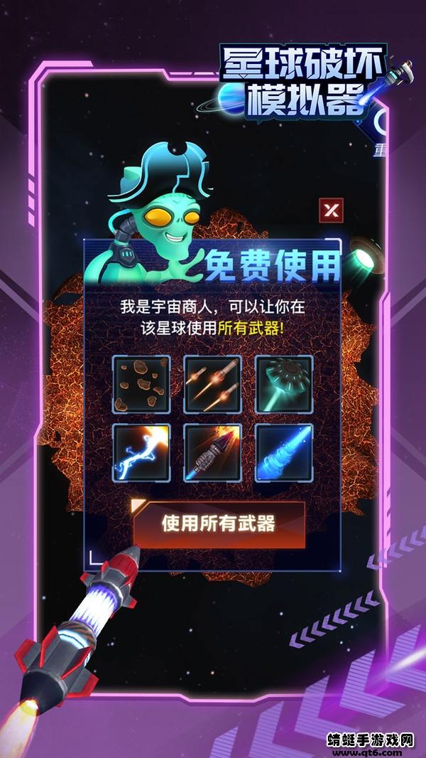 4.各种各样的星球等着你去毁灭,很多武器可以灵活运用,满足你的收藏欲望。