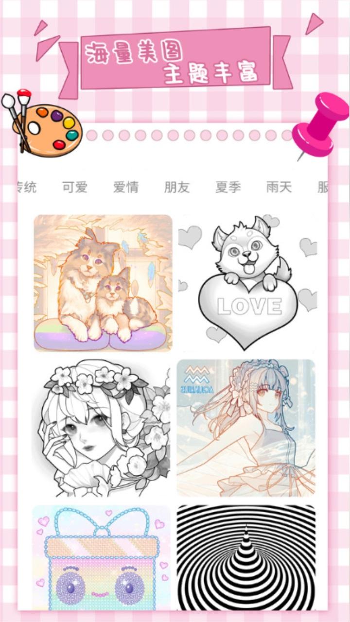 拥有海量填色图片,并且将其进行主题分类,利于分类选择填色图片