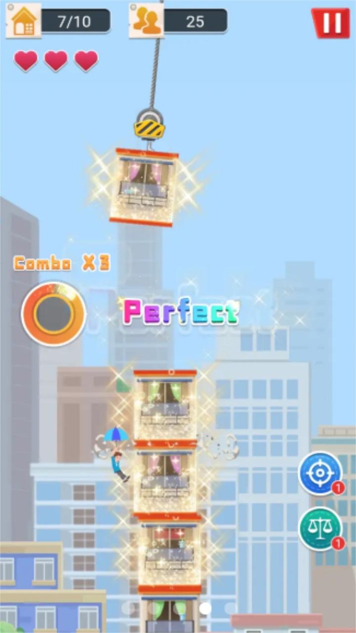 4、点击游戏界面,楼层就会下落,控制好楼层下落位置,保证楼层与楼层之间完美衔接。衔接得越完美,住的人就越多,楼层的收益也越多。