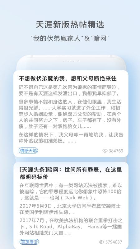 天涯社区手机客户端是天涯社区官方推出的手机软件,平台为大家提供了一个高品质内容的交流方案,引爆最潮的热点话题,缔造无数内涵精彩的网络词语一应俱全,帮你找到跟你志同道合的朋友。