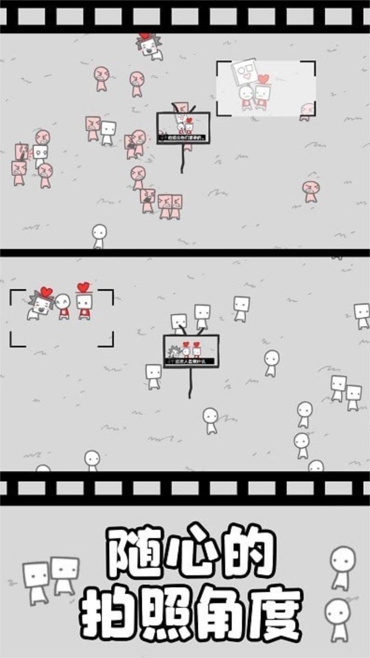 ⑷情侣:一对由小圆与小方组成的情侣,意为呼吁和平的人,游戏前期部分可以在他们身上抓到新闻。比如游戏中的第一个事件,玩家抓拍到一位与众不同戴着帽子的男人投放在大屏幕上,人群中的某些人就会认为这是一种潮流,纷纷戴上了相同的帽子,但随着戴帽子的人数越来越多,这件事情显得不是那么“潮流”,有些人就会拿下头上戴着的帽子,整个游戏故事流程的走向取决于玩家抓拍到的内容,这点就是游戏的核心玩法。