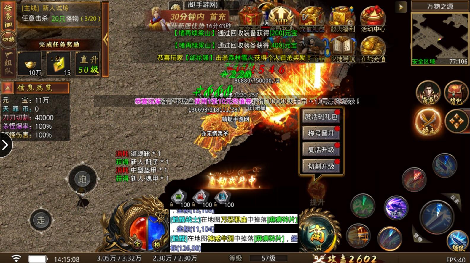 1、三端互通,长久稳定,超高爆率让你满屏光柱随便捡,极品神装随意爆出。
