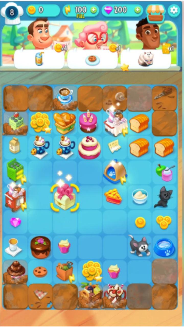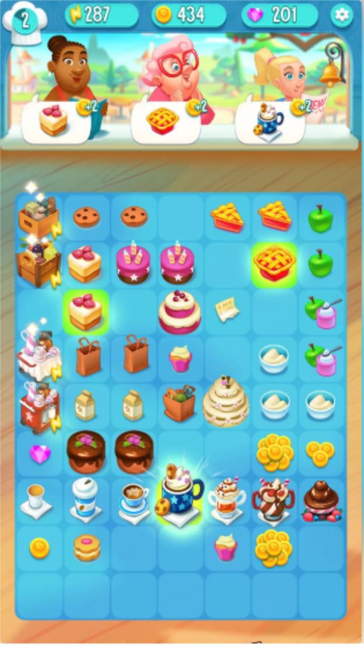 1、探索无尽的新食谱,合并可爱的蛋糕、饼干和咖啡,为饥饿的顾客服务。