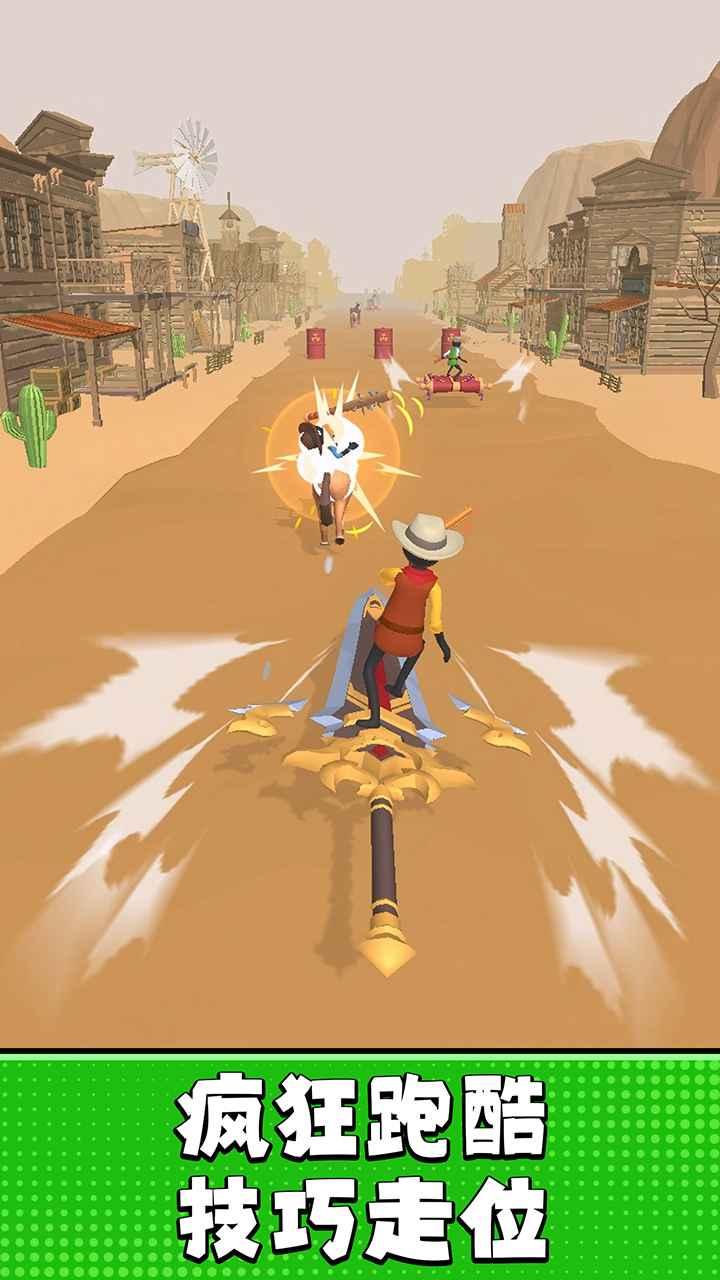 疯狂牛仔是一款模拟竞技游戏,这款游戏以西部世界为背景特色,游戏主要采用竞速的玩法,玩家将扮演一名牛仔到道路上前进冒险,您可以选择坐骑和武器来提高自己的速度,游戏玩起来很欢乐,各种道具都是您意想不到的哦。