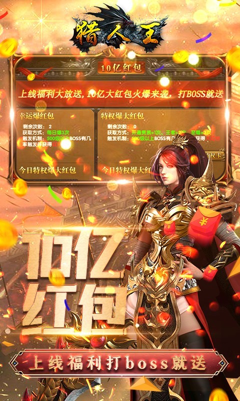 3.打boss掘金,,获取大量充值货币。10红包等你来领!vip免费送,挑战守将提升vip经验。