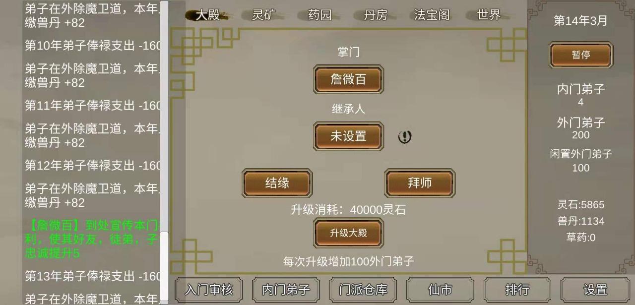 等大殿四级时把各门派关系加到20左右。然后把门派升到六级,再把门派关系加到四十,其他门派就开始年年进贡了。然后再升大殿到八级,门派关系升到60+。大殿升满级后把门派关系加满。然后留200人挖矿,其他全部去采药炼药。***到一千年吧,就能吊打其他门派了