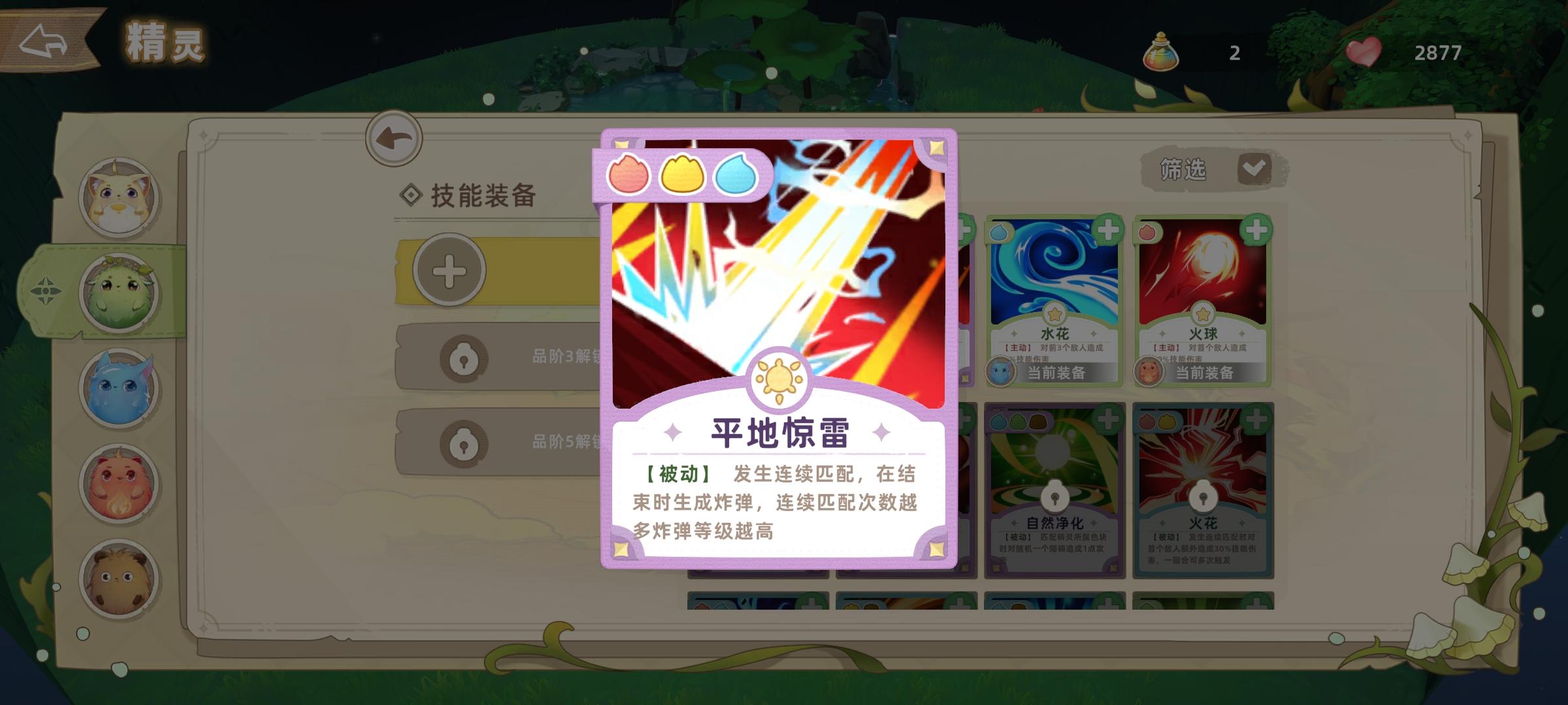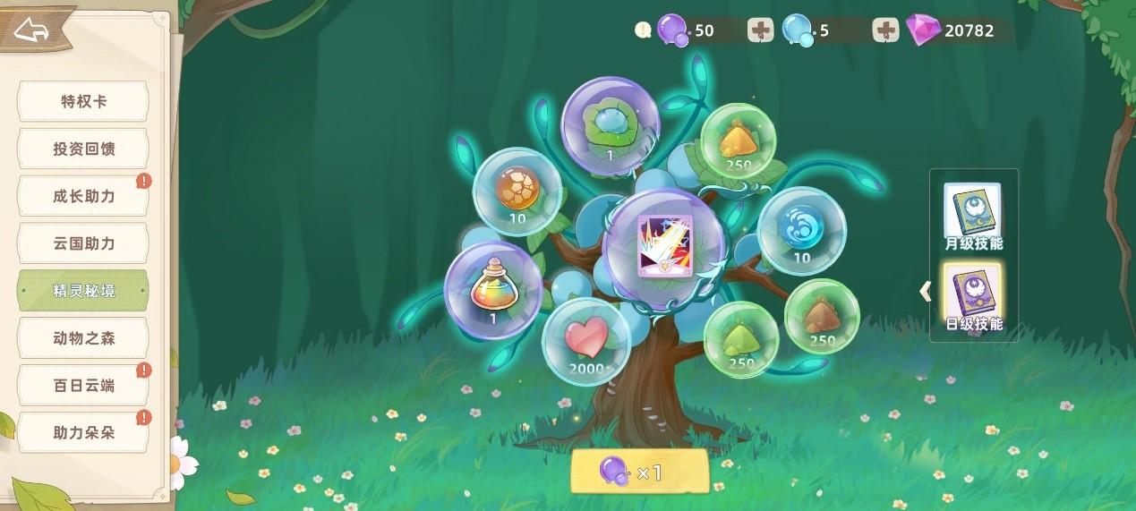 不同的精灵习得技能不同,可参考技能说明的左上角标注,尽快熟悉装备技能的效果能让你在棋盘上消除事半功倍。在精灵秘境中,点亮泡泡树,可以快速获得更强大的精灵技能,首次通关部分守护关卡也可以获得精灵技能哦~