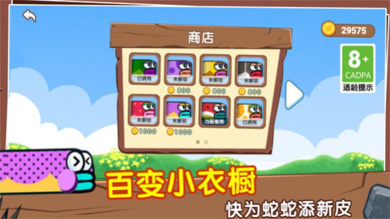 成功挑战每关后都会有丰厚的金币奖励,商店里许多蛇蛇的皮肤等着你来解锁。游戏操作简单易上手,只需控制前后左右即可,老少皆宜。