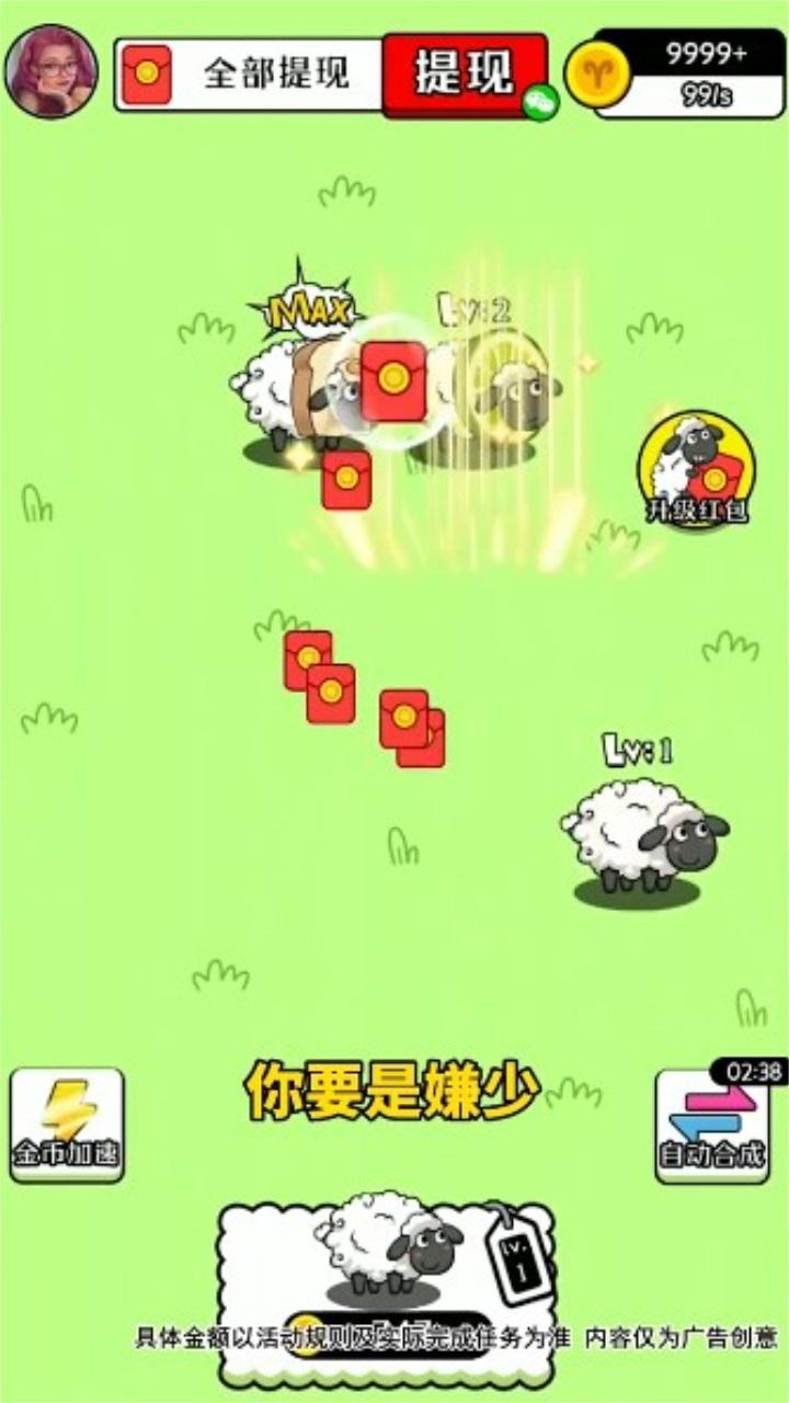 2、每个等级的羊获得的奖金都不同,等级越高红包额度越大。而且随着关卡难度的不断提升,在这里需要耐心进行合成。