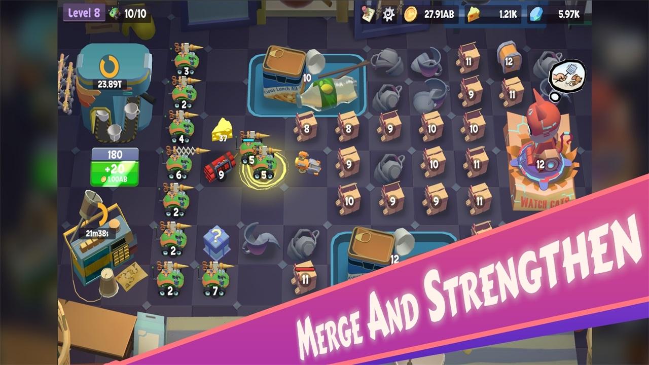 玩具碰撞厨房浩劫是一款休闲的合并游戏,在游戏中玩家需要合并机器人来战斗并建立一个采矿帝国!通过合并、升级机器人,让它们变得更强大,才能打败敌人获得金币和抢奶酪,在这个神奇的闲置游戏中致富,在游戏中建立强大的军队和帝国。