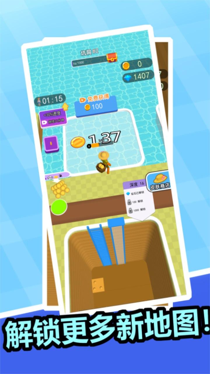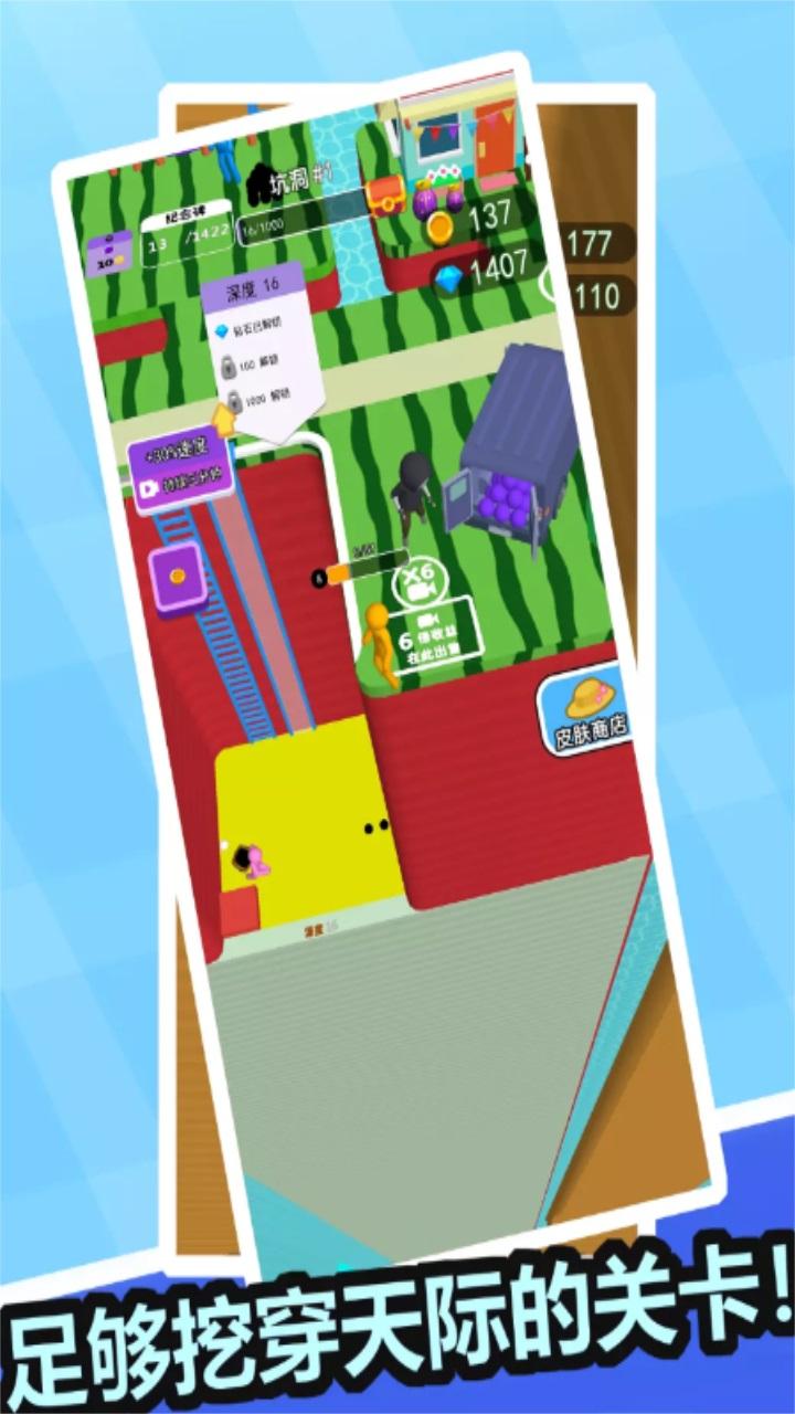 4、玩家通过挖西瓜深洞,挖到地心深处,卖掉挖到的东西,赚取利润!解锁各种版图,雇佣矿工模块,可以获取自己想要的矿工,协助玩家一起挖洞,获得砖石,出售获取利润!