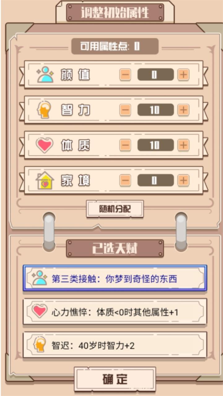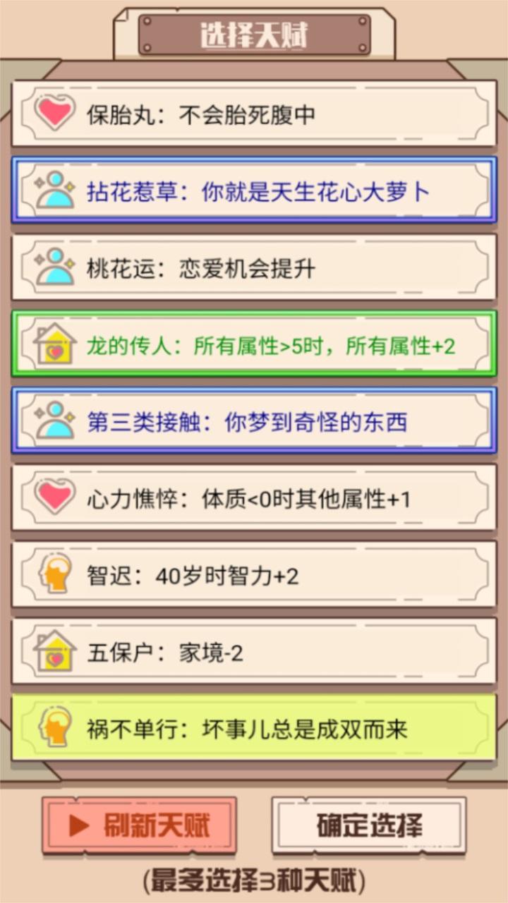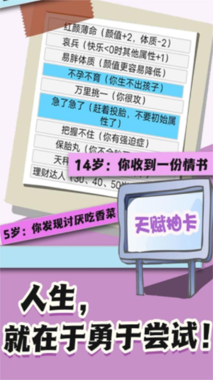 2、随时可以重新开启人生,但是各种天赋和属性都是随机获得的,会迎来完全不同的人生变化。
