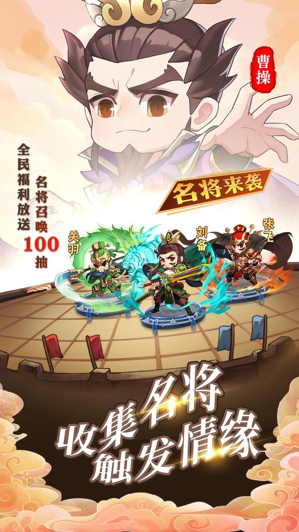 主公在此手游是一款全新推出的三国类卡牌手游,游戏将带你走进一个全新的三国世界,Q版的卡通风格设计,简单易上手的游戏玩法,上线就送连抽,不花一分钱,天天领神将!