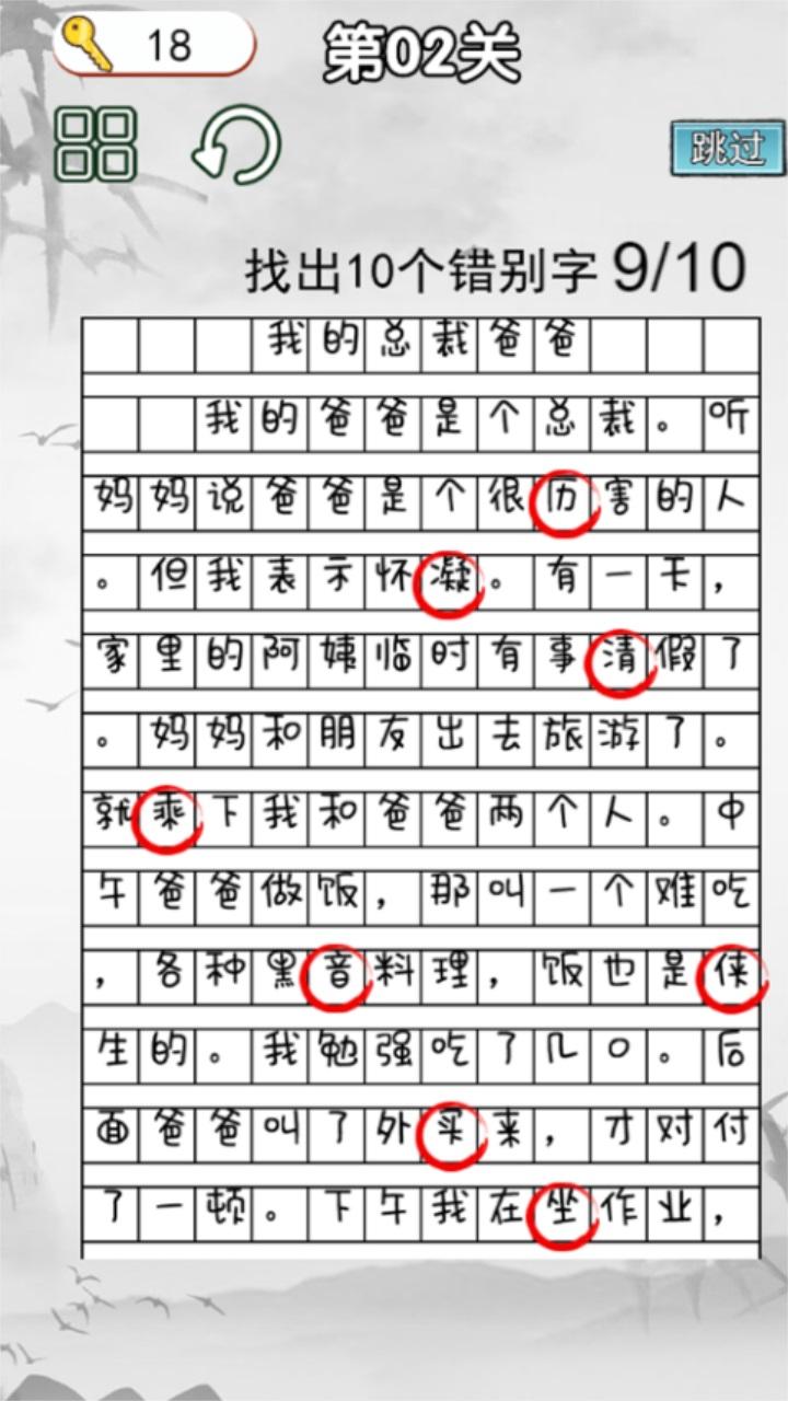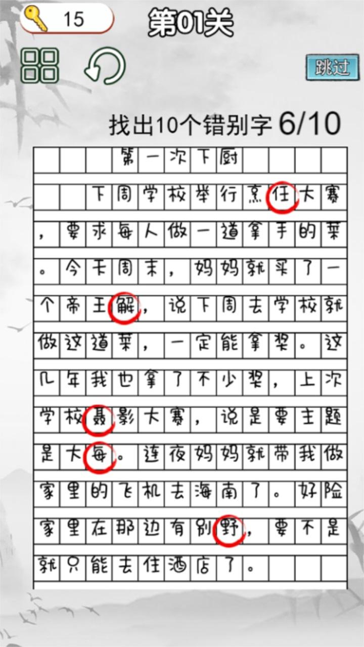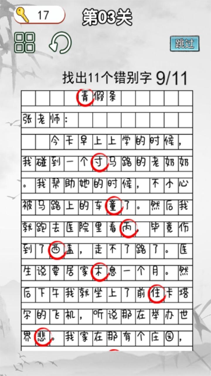 3、需要对给出的汉字进行更好的挑战,有着各种的难题带来。一字一句的检查并纠正所有的错别字!你将在关卡里修改这些错别字,你需要通过点击对应的汉字来纠正它们,点击对应的错字就可以改正,当找齐所有的错别字后就可以成功通关。