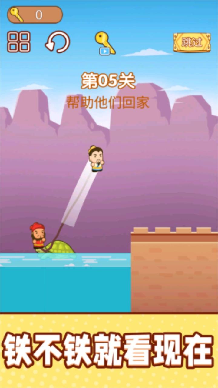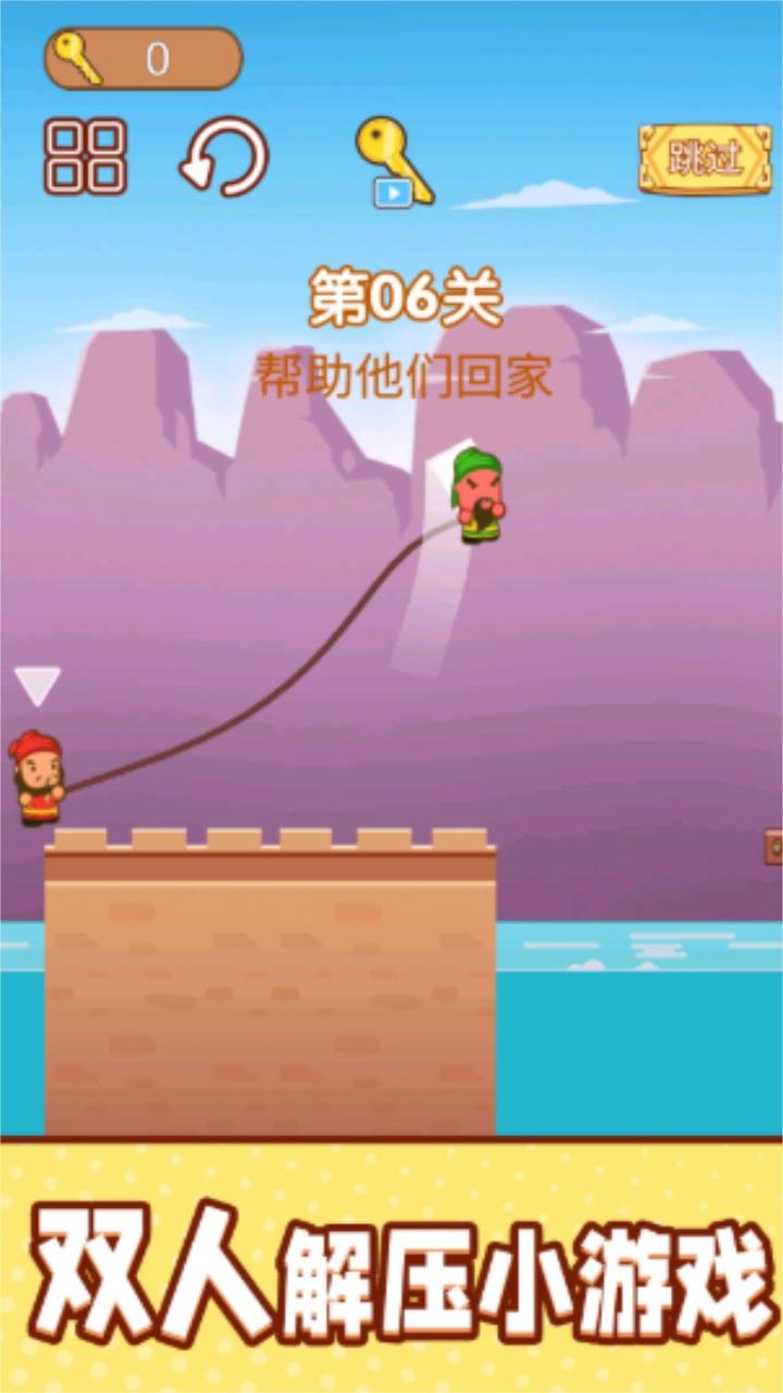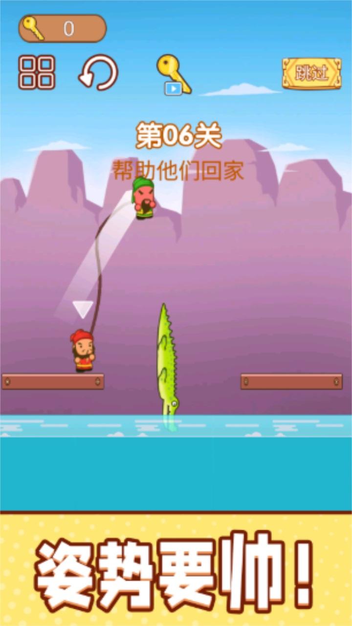 5、刘关张三兄弟开始了一起跳跳冒险,这是一款趣味三国题材的闯关躲避游戏,操控熟悉的Q版三国人物来闯关挑战吧,在游戏中需要依靠绳索来进行闯关,必须要合理的进行力度控制。