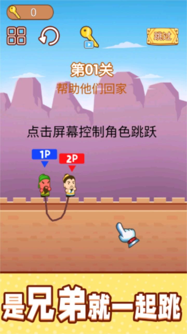一起跳跳冒险是深圳市指天椒科技有限公司推出的一款双人闯关跳跃的游戏,铁不铁就看现在,跳跃的姿势要帅,是兄弟就一起跳,是双人解压小游戏,我们还可以自由的尝试最新的模式,萌系三国刘关张三兄弟来闯关了。