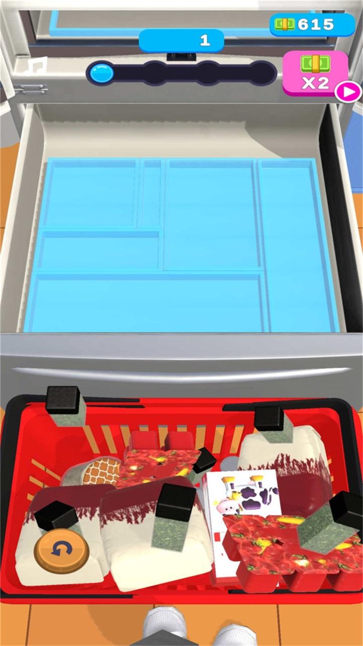 他的游戏玩法就是让你摆东西。打个比方吧,就好比你去一些小超市打工,然后里面有一份,就是你需要把货架上的所有商品排满的这么一份工作,到了晚上空的时候就得排放上去。有打过的应该了解,或者说你常看一些动漫的话,应该也会出现这种情景。总之游戏玩法你可以理解为这个,但可供你摆的地方只有冰箱。啊对,没有别的了。整个摆放的过程怎么说,其实无非就是点点点点点,但是要说细节设计也不是没有,比如说你稍微点了有一点偏差,它的位置就会偏移,而且位置一旦偏移,你就不能完完全全的把所有的东西都摆满,肯定会漏那么一两个在外头。但是这个我并不觉得是什么好设计。啊,为什么这么说呢?因为大伙都是手机屏幕对吧,