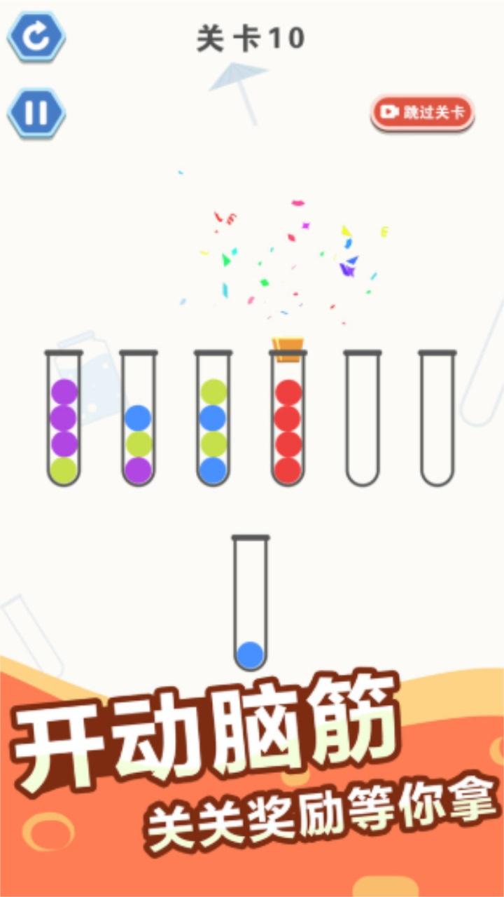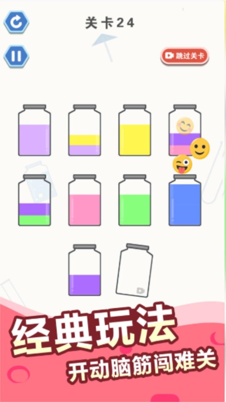 游戏拥有简洁的画风和多样的关卡,游戏上手简单,老少皆宜,内容丰富,如果您无法完成某个关卡,则可以重新启动或跳过它。简单的操作玩法模式,你可以控制水瓶来倒入不同的液体,让液体变换不同的颜色。更有多种排序方式,关卡多样供玩家进行体验。