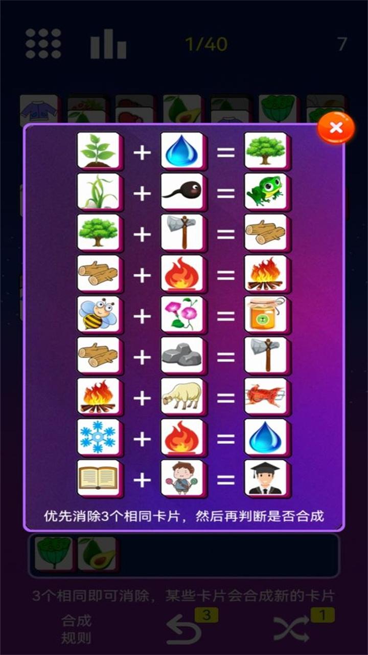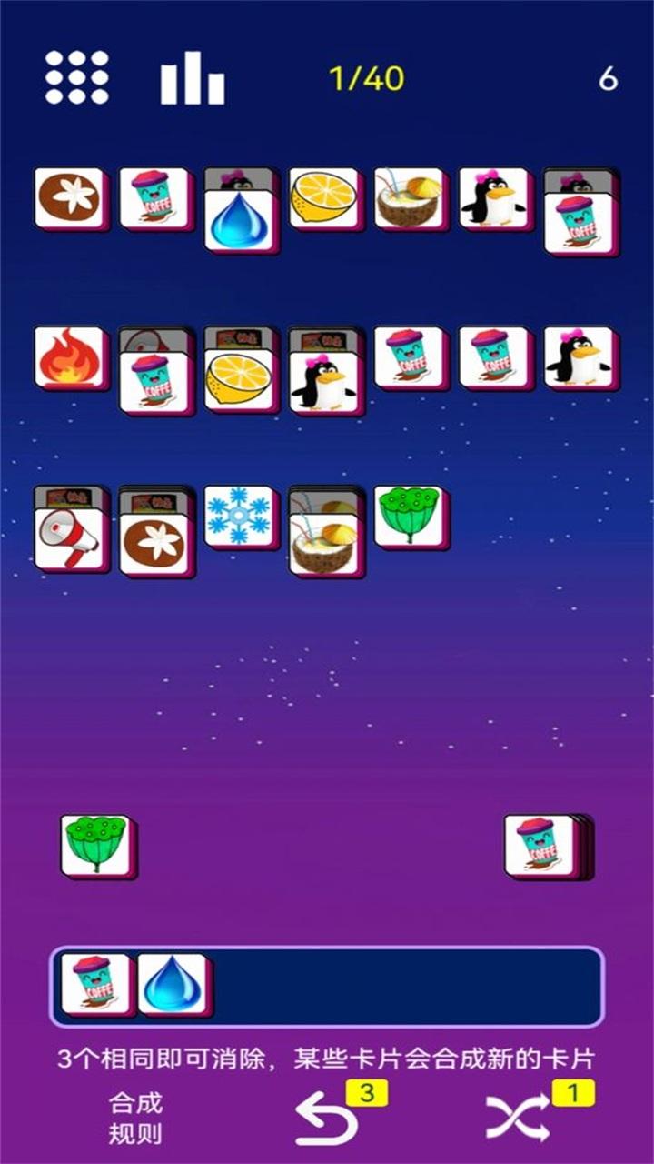 一关游戏至少由三层及以上的方块构成,从最上面开始点击方块到收集框中,三个相同的则会消除,不同的会留在框中,等有相同的之后才会消除,如果有两个相同的,会自动相邻排列,更容易观察到哪个图形差一个消除。同样的,因为有一些重叠不是完全重叠,所以可以从露出来的角落了解到是哪一个图形,能够更好的得到想要的图案。