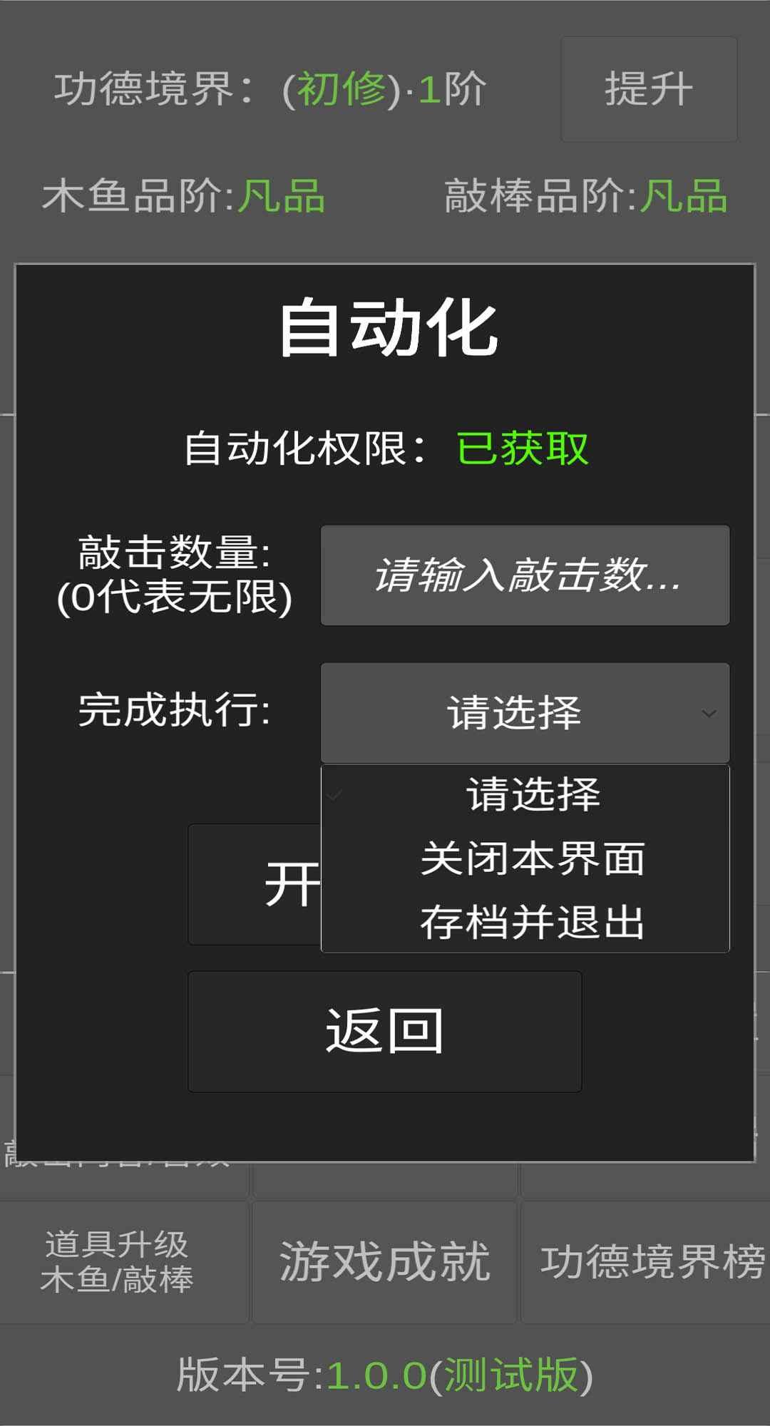 游戏支持自动化敲击木鱼,您可设置敲击次数,并可设置敲击完成后的任务执行,包括关闭游戏等操作,名副其实的助眠小能手。