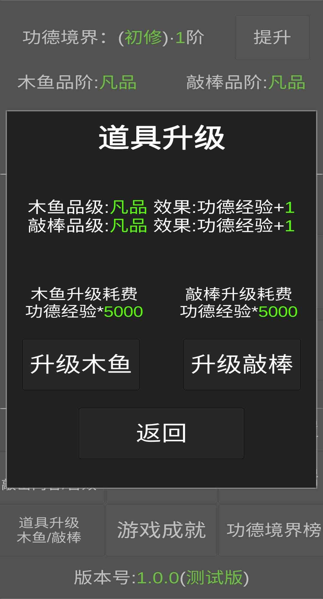 道具升级:本游戏支持木鱼和敲棒的品阶升级。