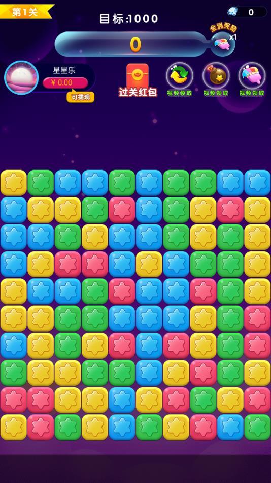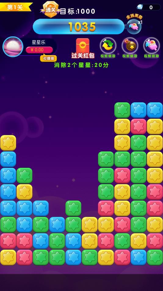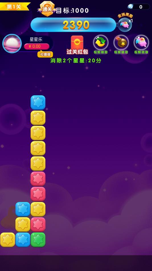 消除星星乐是一款容易上手的经典消除游戏,手指轻点即可进行方块的消除,同时消除的方块越多,所获得的的积分也就越多,反之亦然,每一关都是有着目标分数,达成目标即可闯关成功,没有达成目标,就需要重新开始闯关,而且还有红包奖励领取。