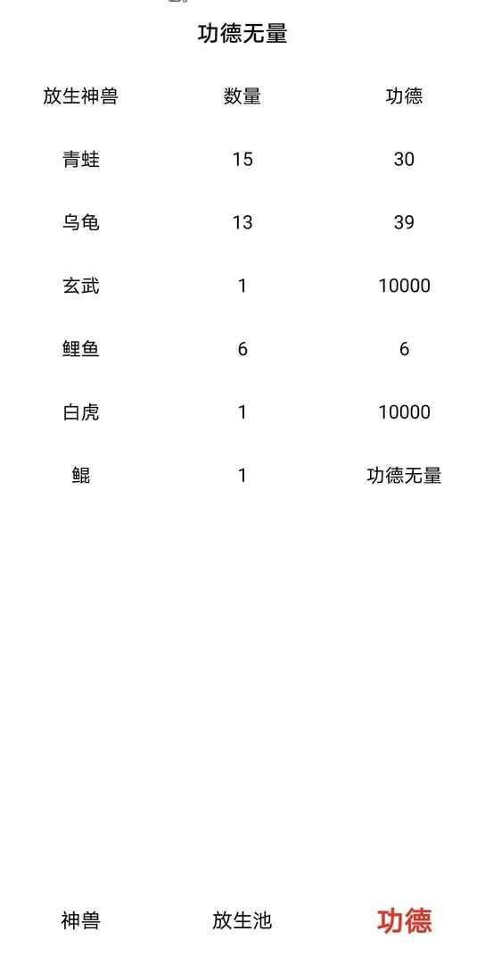 放生手游和最近火热的敲木鱼游戏相同,都是让人轻松的在游戏中体验非常休闲的养心游戏,不同于敲木鱼需要慢慢的敲,此游戏中拥有很多不同的动物等待你的放生,每天放生不同的动物可以积累不同的功德分。