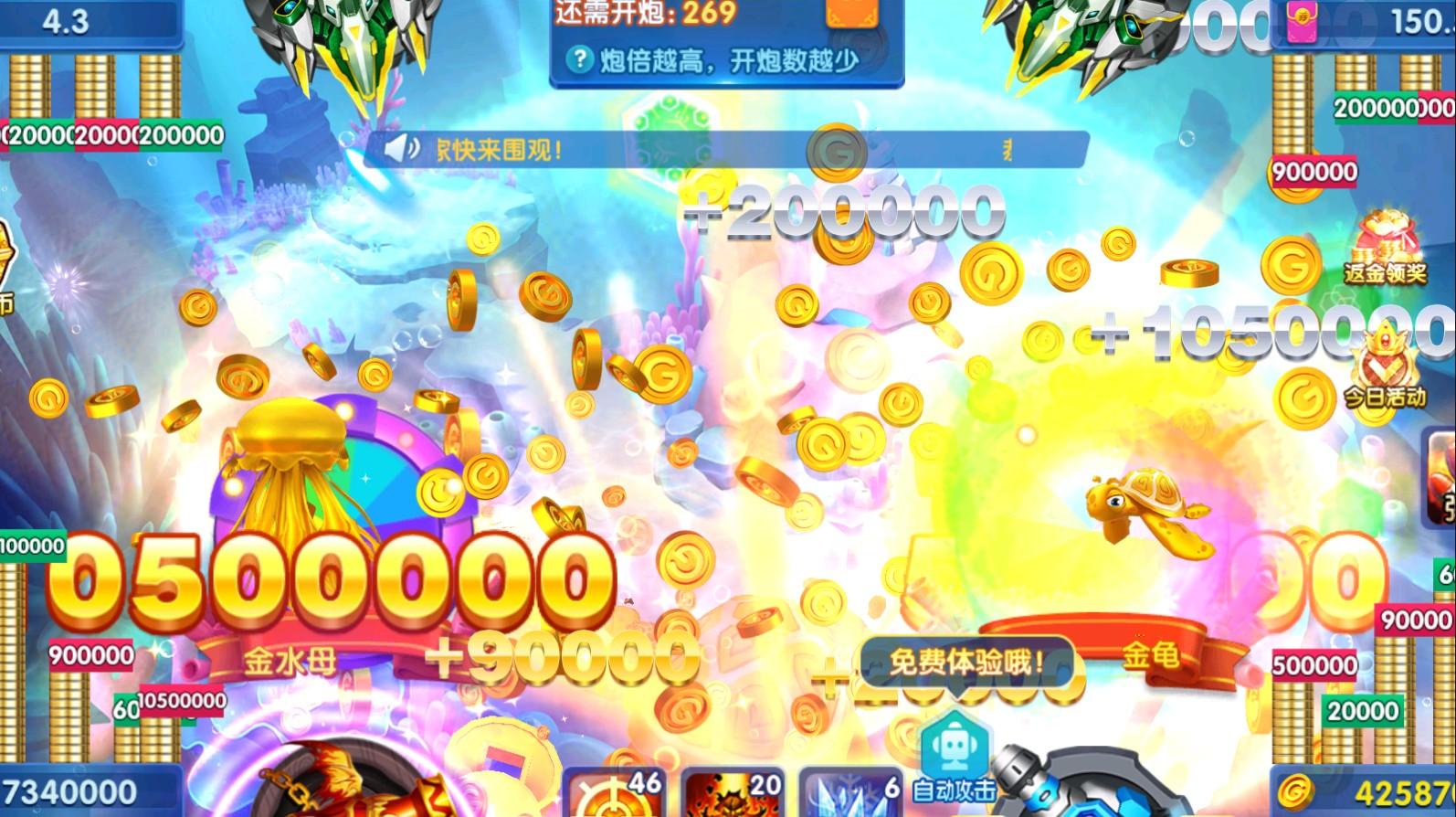 万炮轰炸,爆屏刺激,轻松直升功能让你打造强力炮台捕鱼所向披靡!