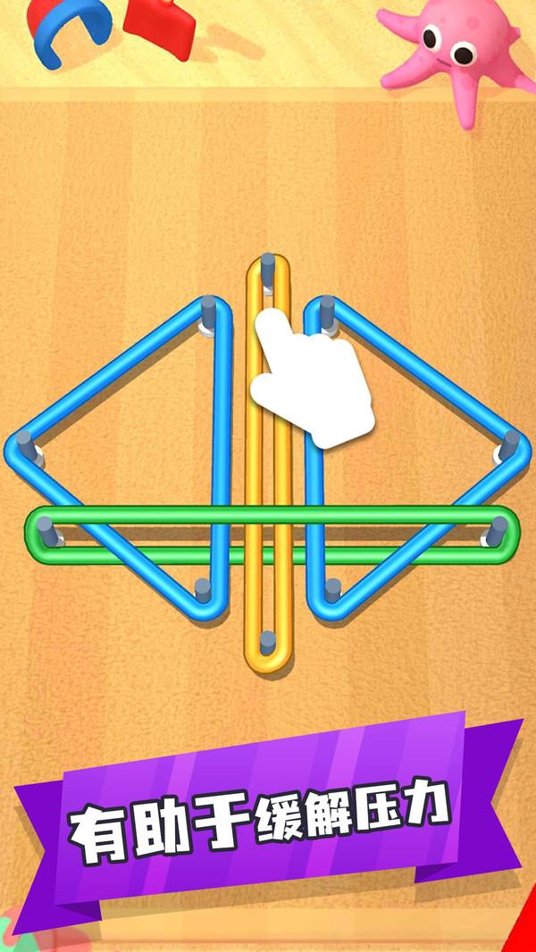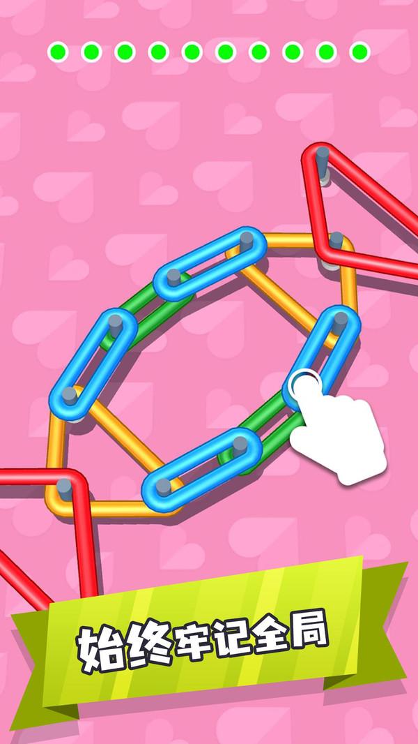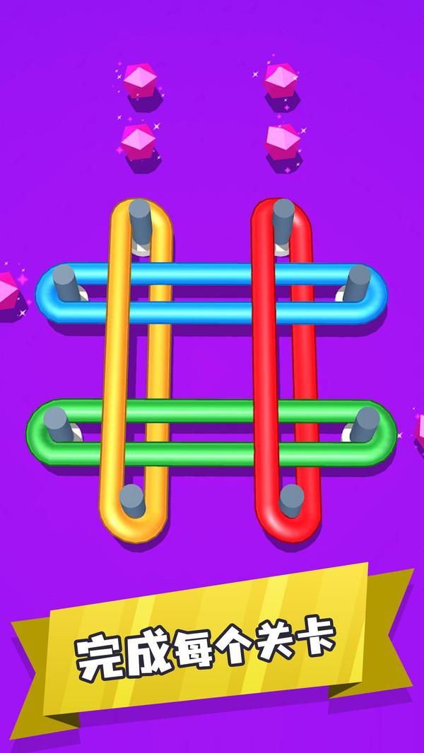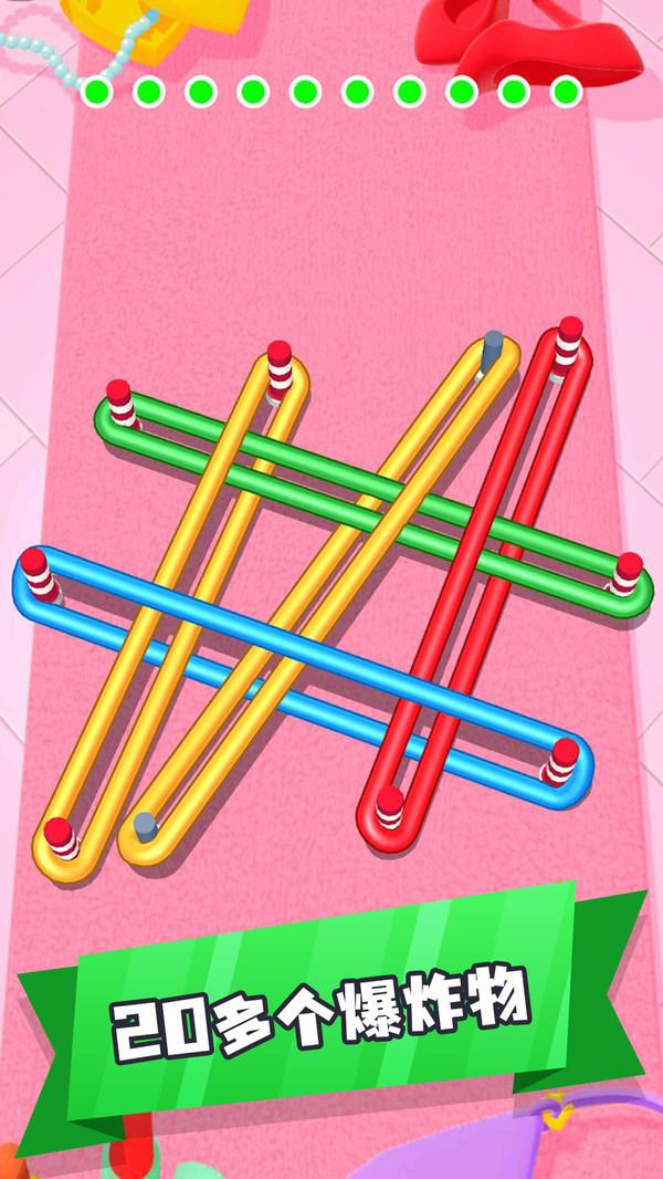 橡皮筋大作战游戏采用了非常有趣的解谜玩法,在每一关的关卡中你需要解决橡皮筋在一起缠绕的问题,按照不同的颜色和任务要求来解决橡皮筋的问题,完成任务需求来解开所有的皮筋,从而解锁更难的关卡。