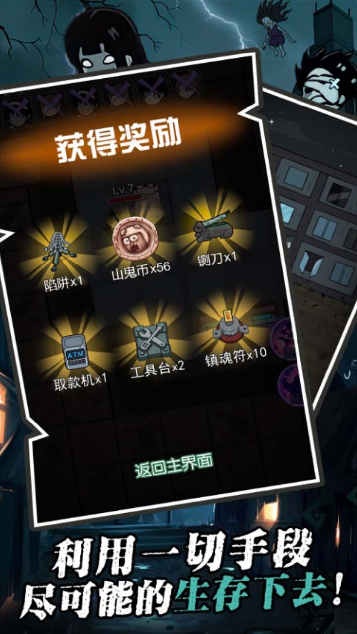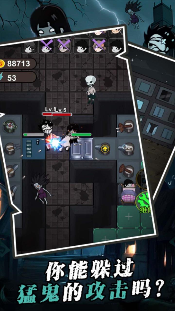 寻找合适的房间,抵抗猛鬼。在与猛鬼周旋中不断丰富房间装置,对抗强攻,顺利存活才能闯关成功!听说校舍楼道外有猛鬼出没,勇敢的你根本不怕,直接在床上躺平发育,累积无限金币!