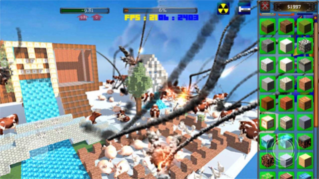 4、这是一款物理沙盒创造与破坏游戏,您可以在平台上创造各种建筑,不仅有方块还有各种奇怪道具,搭建出建筑后,选择武器来一场绚丽的破坏吧! 游戏中还有各种烟花,快来开始烟火表演吧!